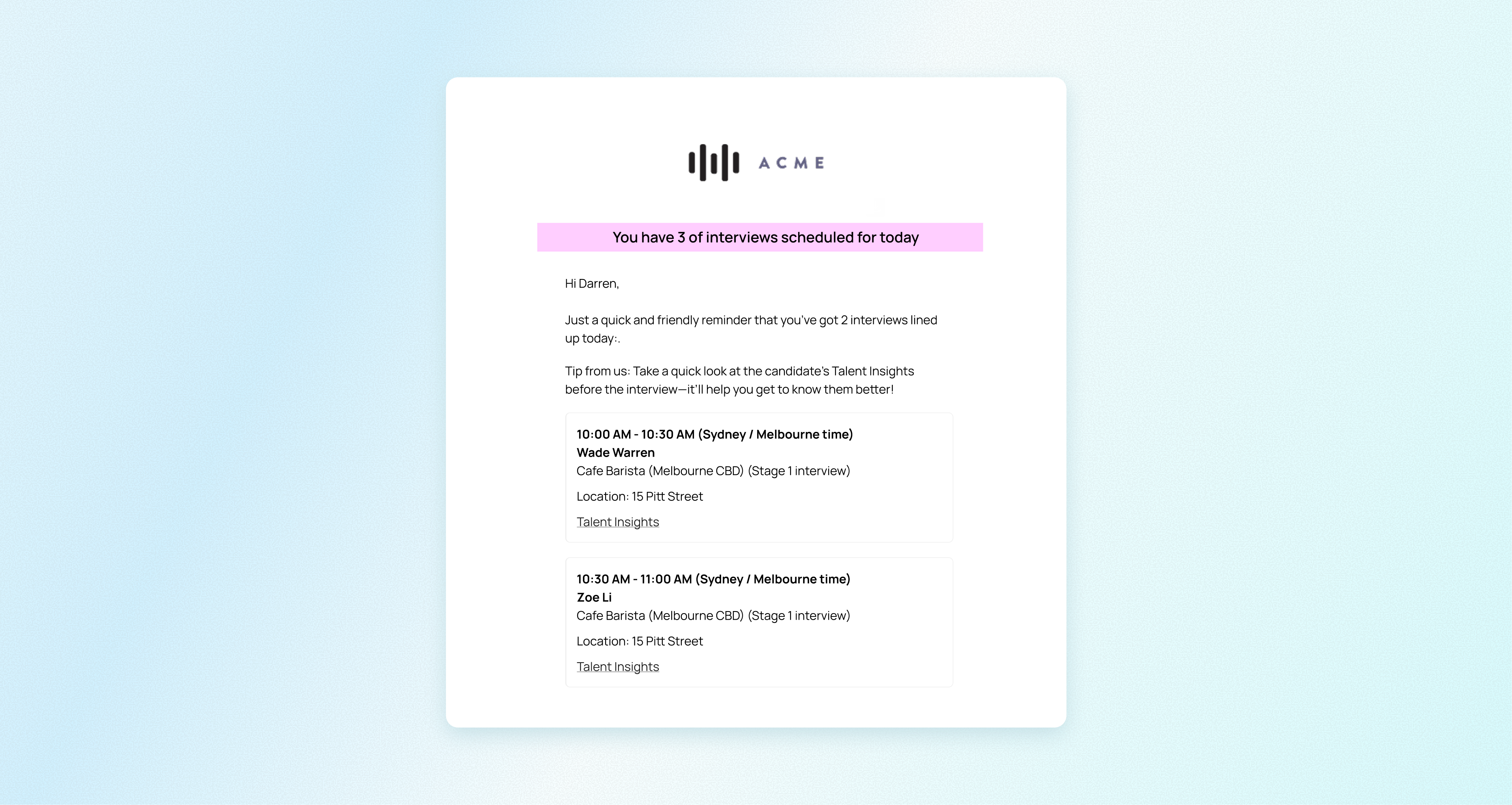 Since not all interviewers use calendar tools, we automatically send email run sheets on the day of their interviews with candidate details, and recommended interview questions.