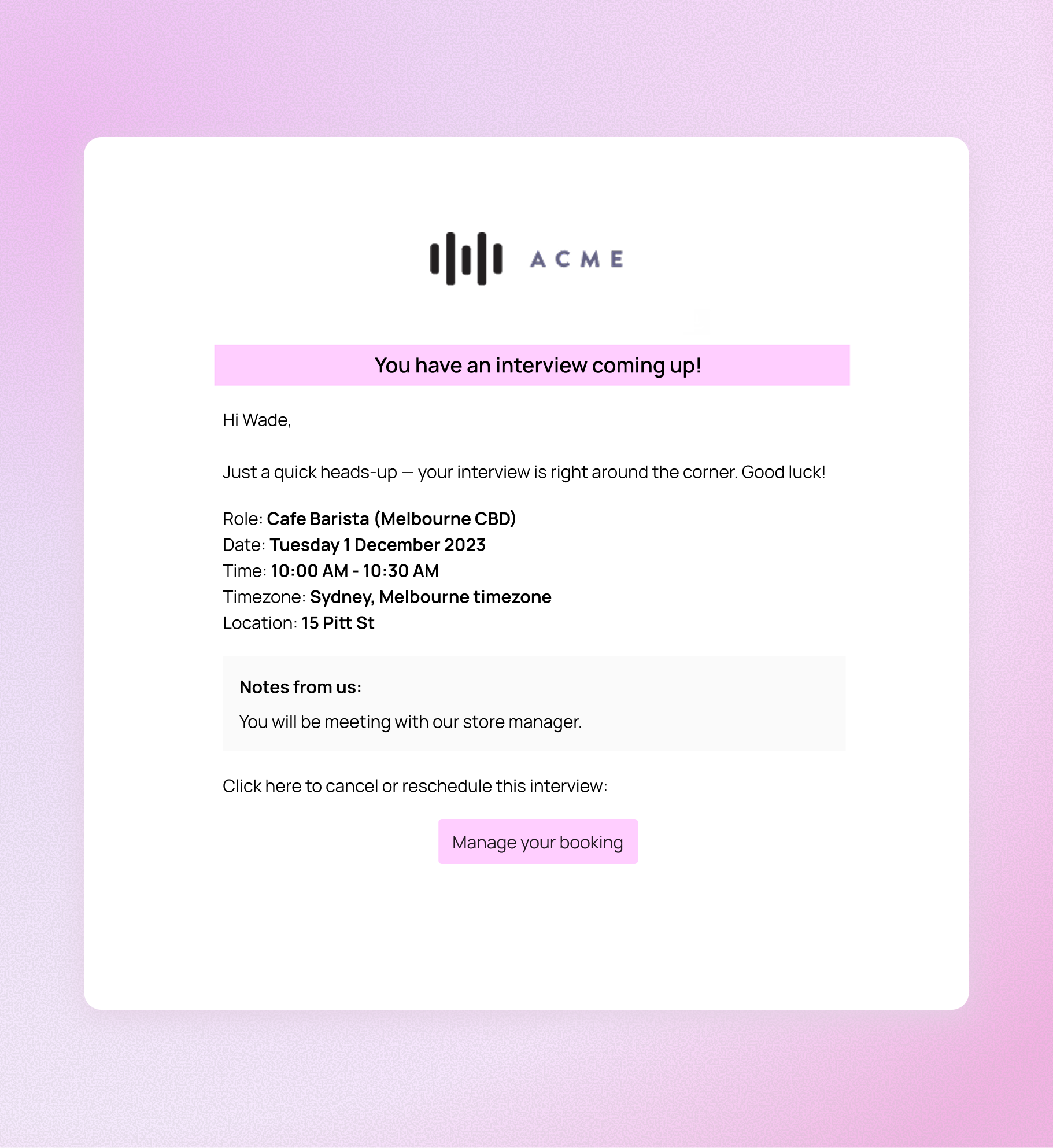 Candidates can reschedule or cancel directly from their email or iCal invite.