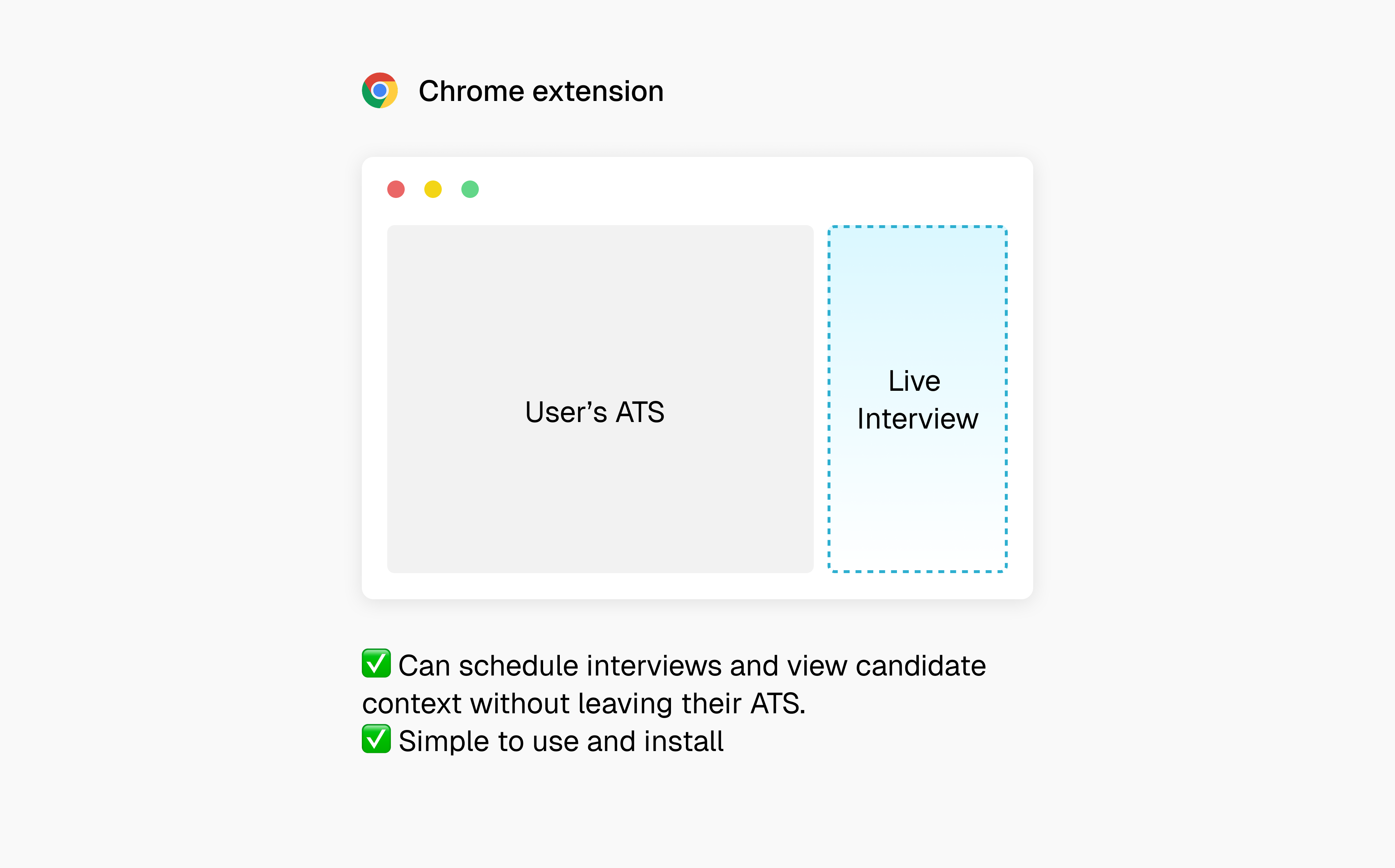 A chrome extension for scheduling interviews as allows users the flexibility to schedule without leaving their ATS (Applicant Tracking System).