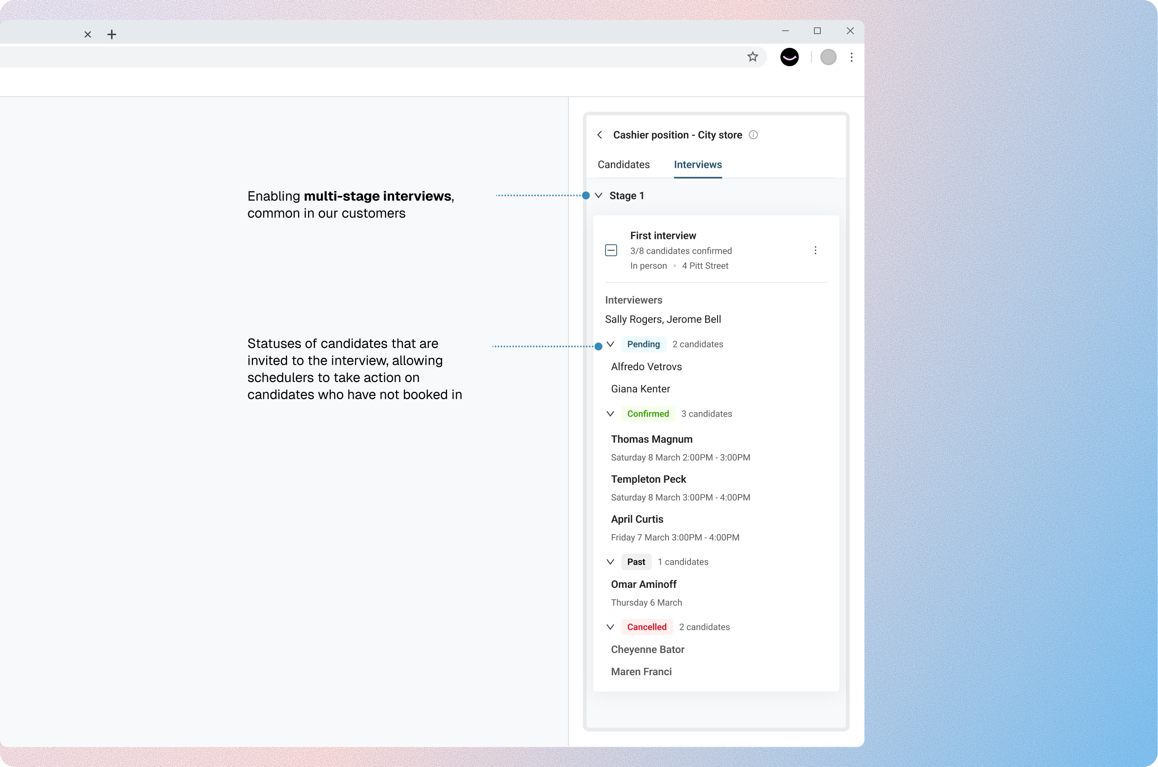 Multistage interviews were a standard practice. In Live Interview, schedulers can book multiple rounds for the same job and track them all from a single view.