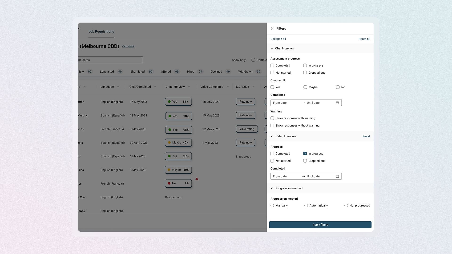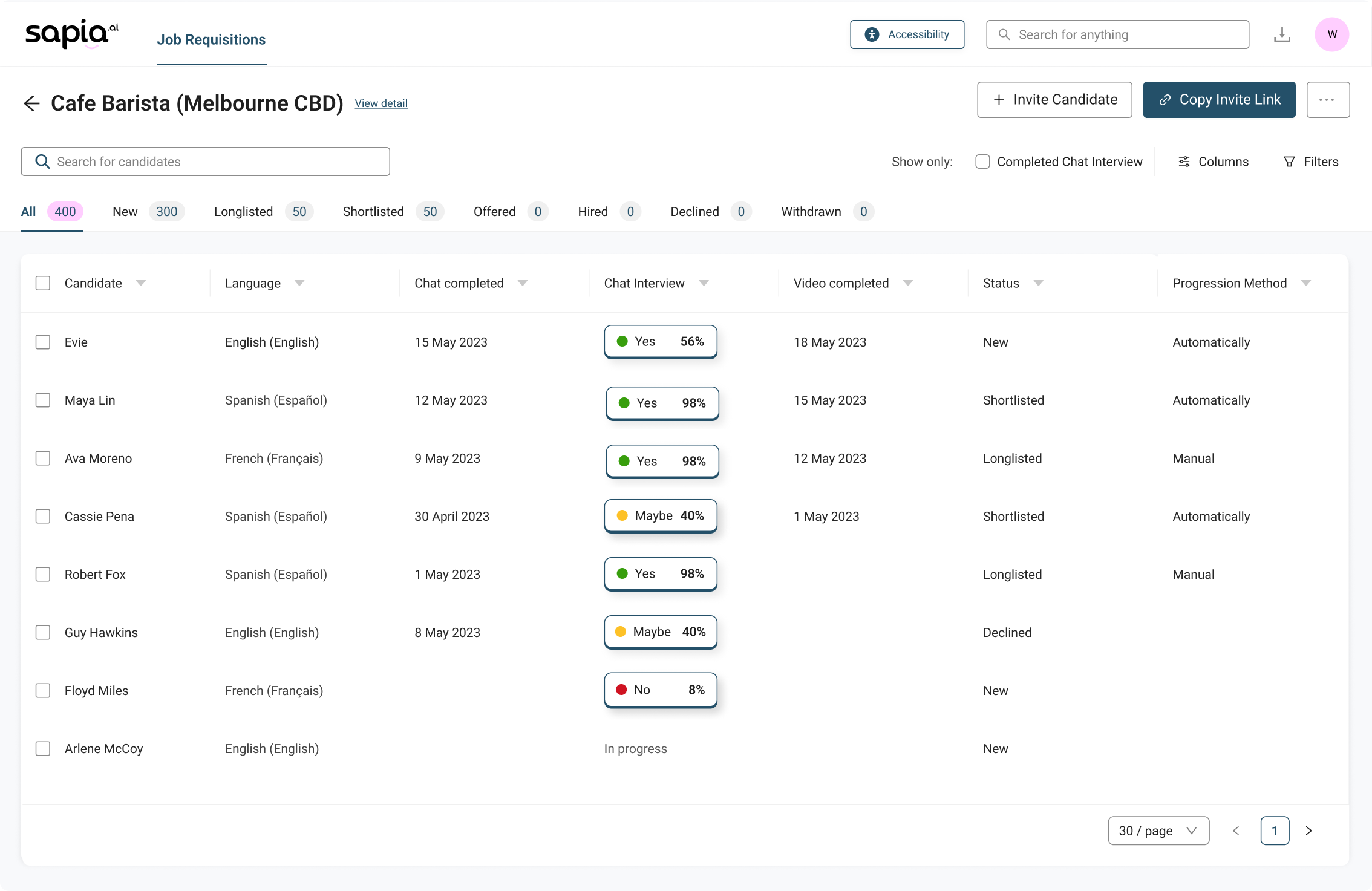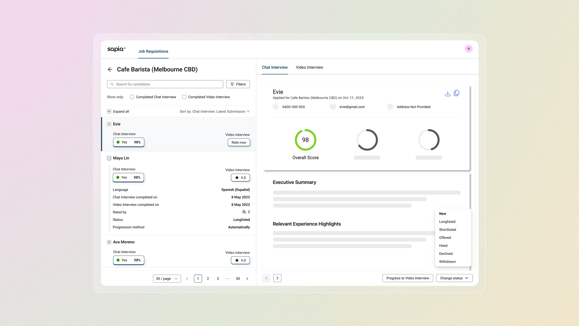 Hiring managers can now access reports on the right, browse candidates on the left, manage applicant status from the bar below, and all in a single screen. Fewer clicks, less back-and-forth.