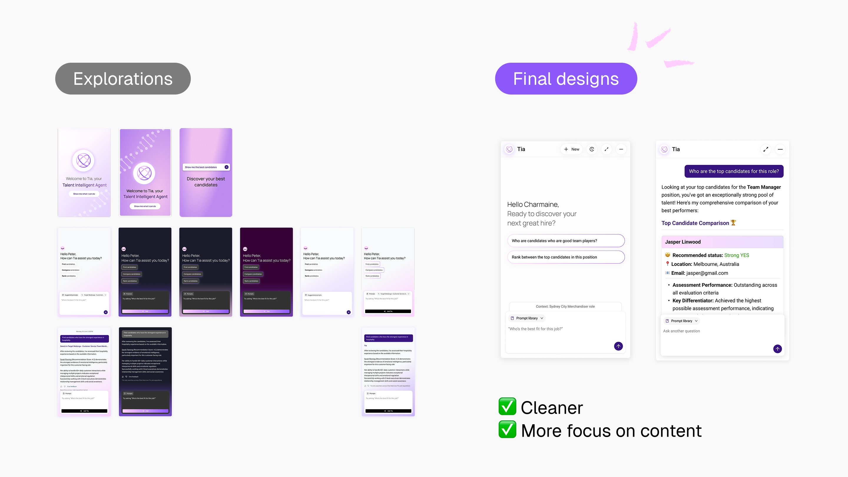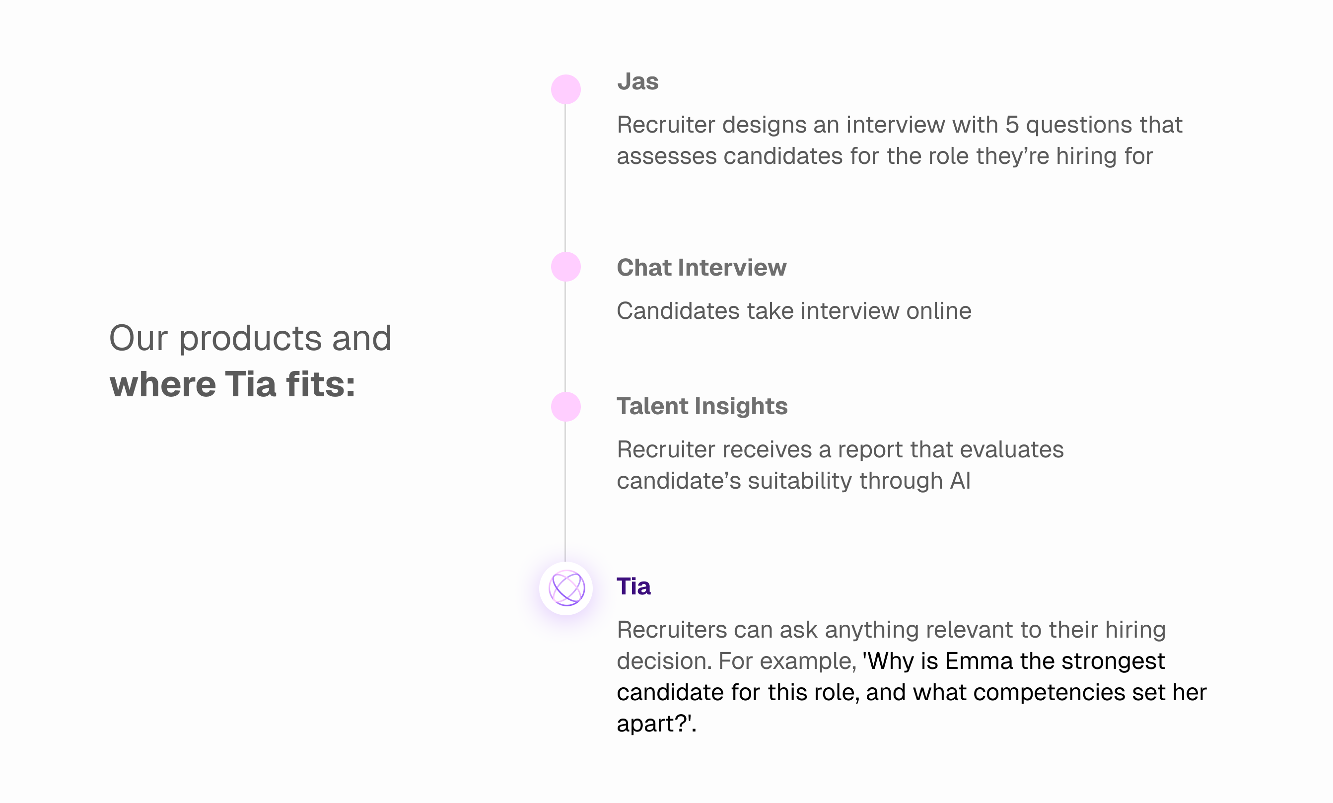 We surface Tia's reasoning in real time, keeping users informed and bringing transparency to how top candidates are evaluated.