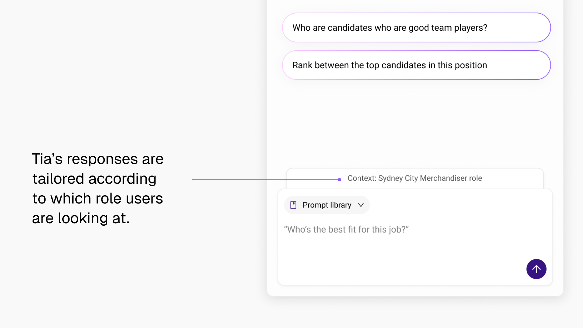 When recruiters are viewing a job in their ATS, we incorporate that context into the chat and evaluate candidates based on the role they’re looking at, creating a more relevant and contextual experience.