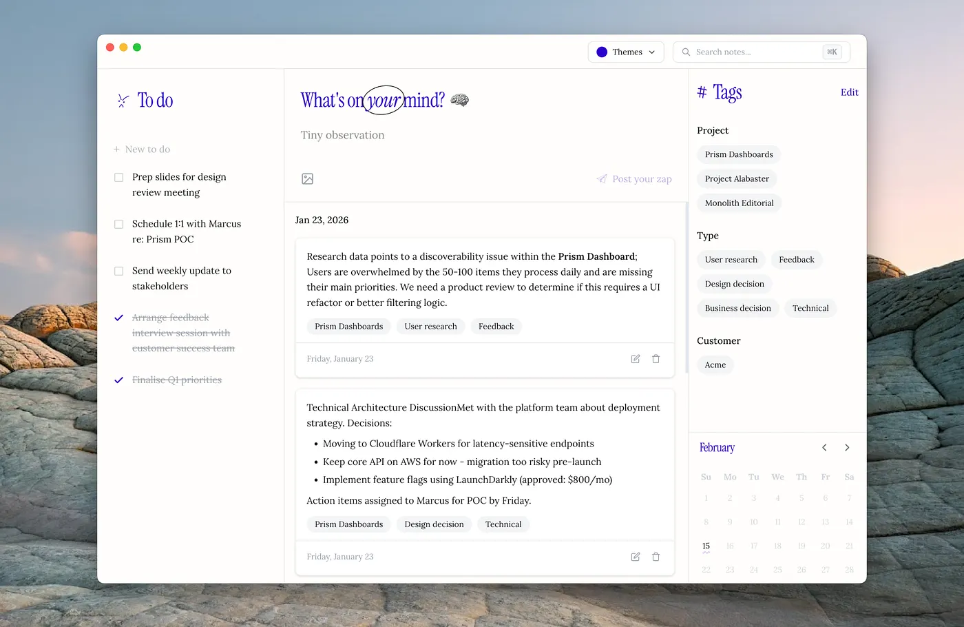 I also borrowed from Raycast — a global shortcut that surfaces a small input window, so I can log a thought without switching apps or breaking focus.