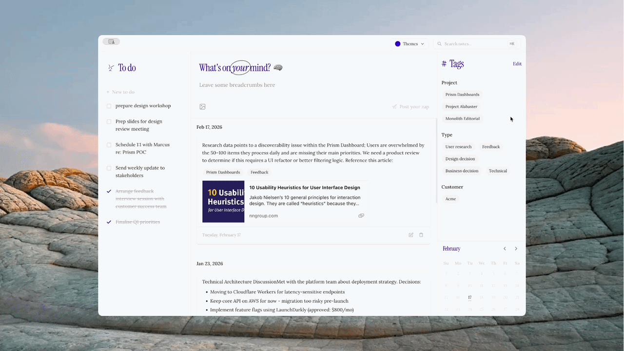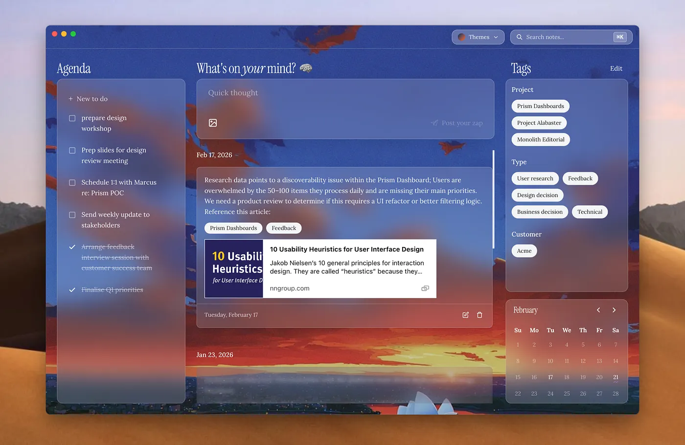 Notion worked well for long‑form docs like case studies and planning, but not for the quick, messy notes I take during the day. My notes would pile up in one endless page and become impossible to scan.